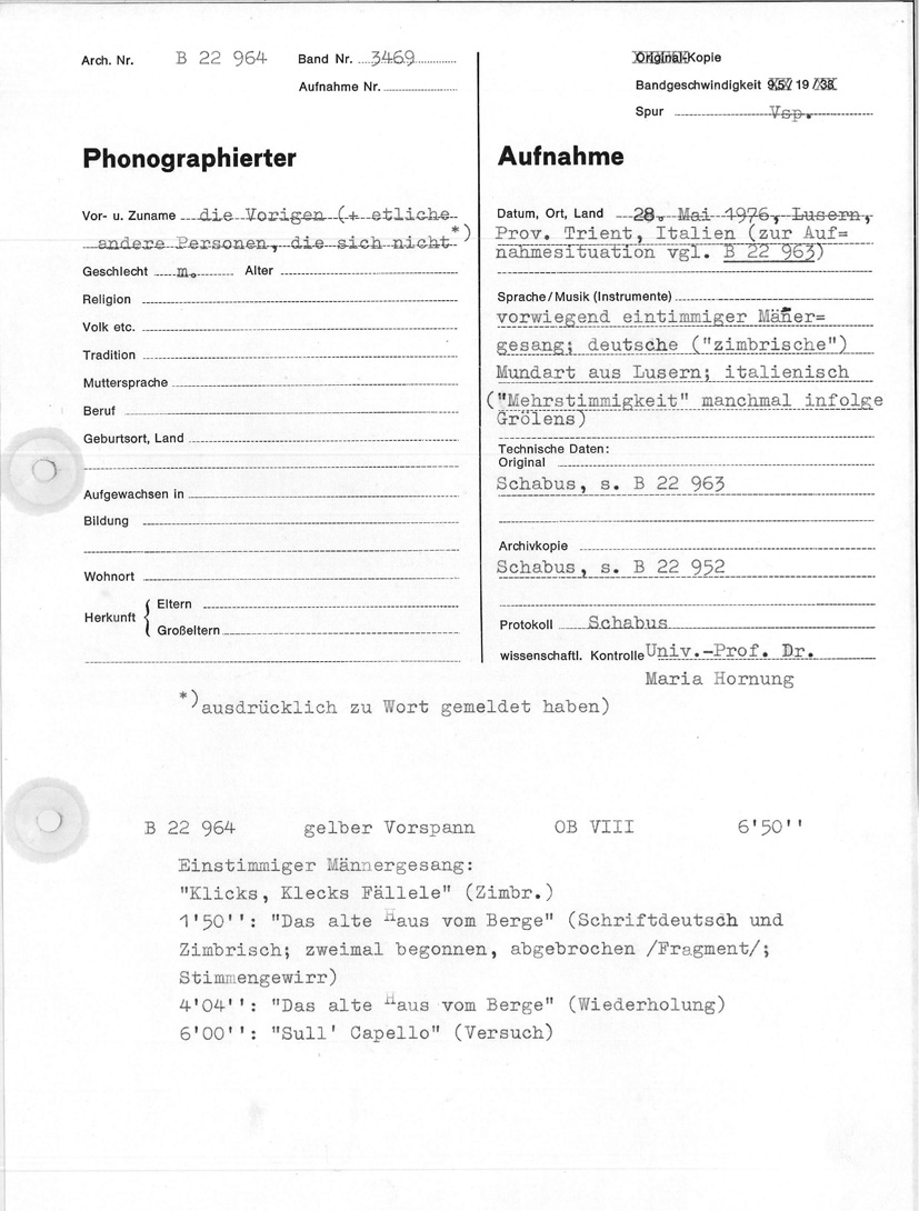 (Luserna, 28.05.1976; responsabili: Dr. Wilfried Schabus; Prof. Maria Hornung)