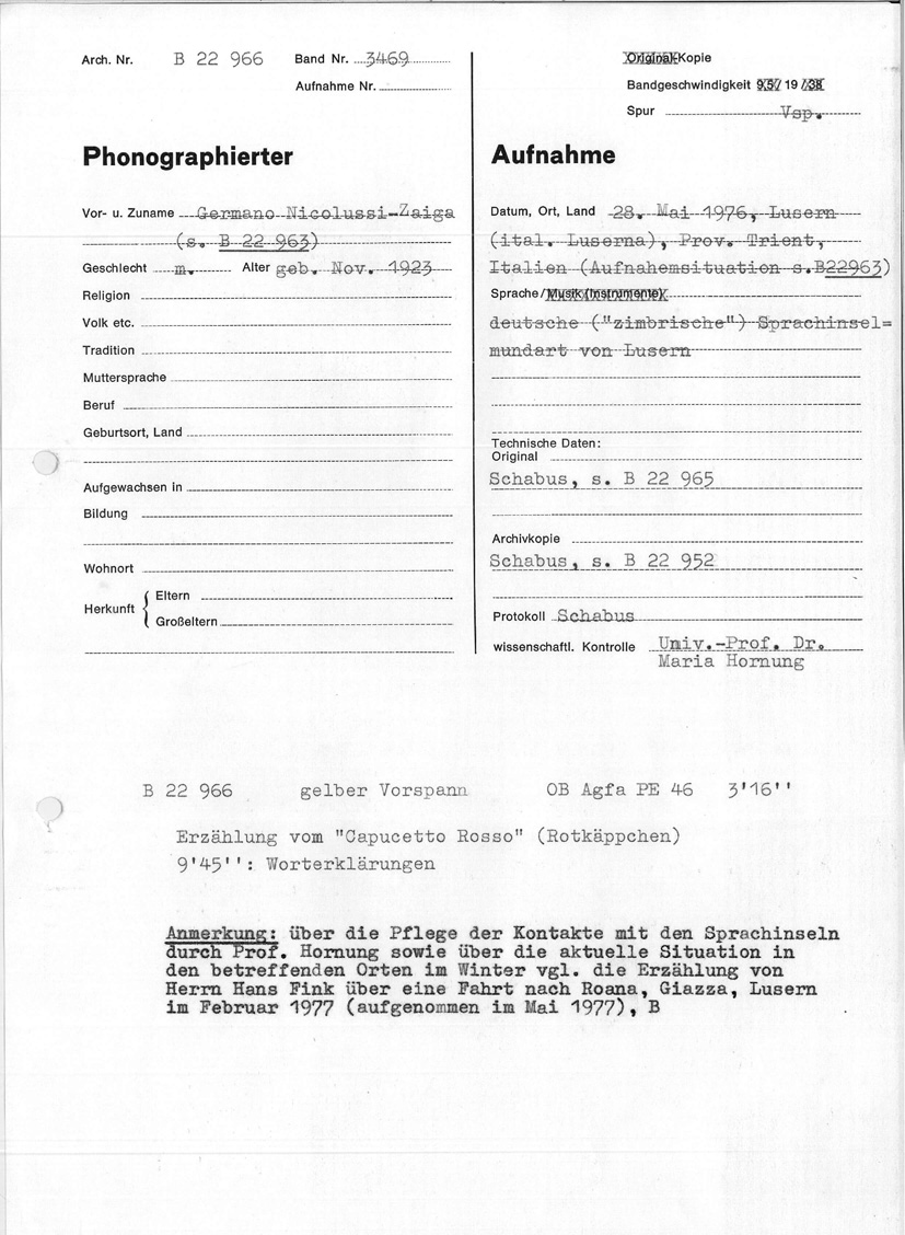 (Luserna, 28.05.1976; responsabili: Dr. Wilfried Schabus; Prof. Maria Hornung)